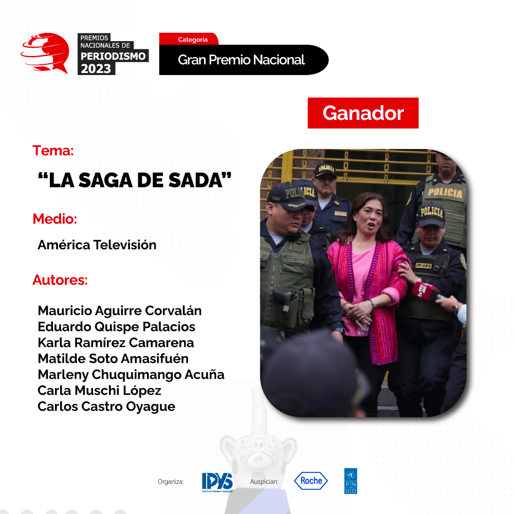 En esta edición, el dominical de América TV, Cuarto Poder, fue galardonado con el Gran Premio Nacional de Periodismo y Mejor Reportaje Televisivo por ‘La saga de Sada’. La investigación, compuesta por 14 reportajes, reveló la red de corrupción liderada por la empresaria Sada Goray Chong en el Fondo MiVivienda y la Superintendencia Nacional de Bienes Estatales (SNB), lo que desencadenó la caída del gobierno de Pedro Castillo y una investigación fiscal a empresarios poderosos.