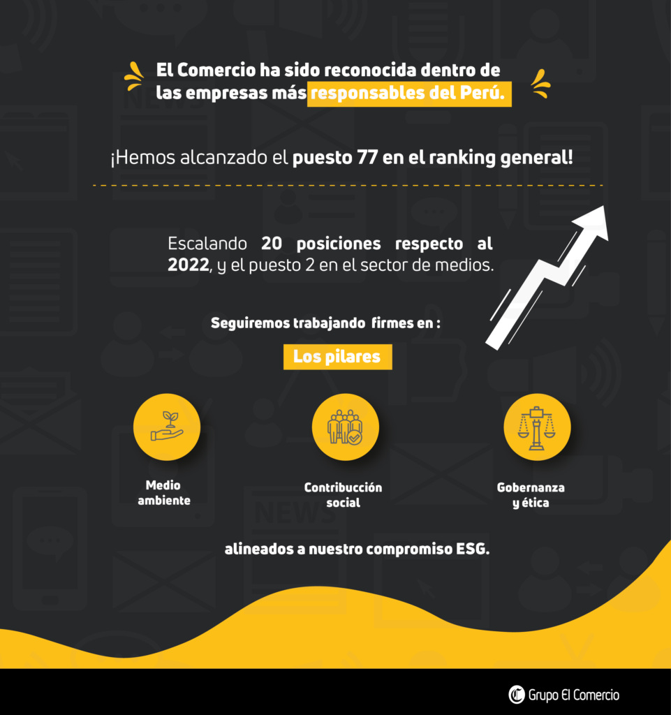 Que El Comercio forme parte nuevamente de este ranking nos impulsa a renovar nuestro compromiso con el Perú, por lo que seguiremos trabajando en los pilares de medio ambiente, contribución social, gobernanza y ética, alineados a nuestro compromiso ESG. Por su parte, continuaremos a la par con nuestro propósito de empoderar a las personas mediante información de calidad, que les permitirá guiar sus decisiones del día a día.